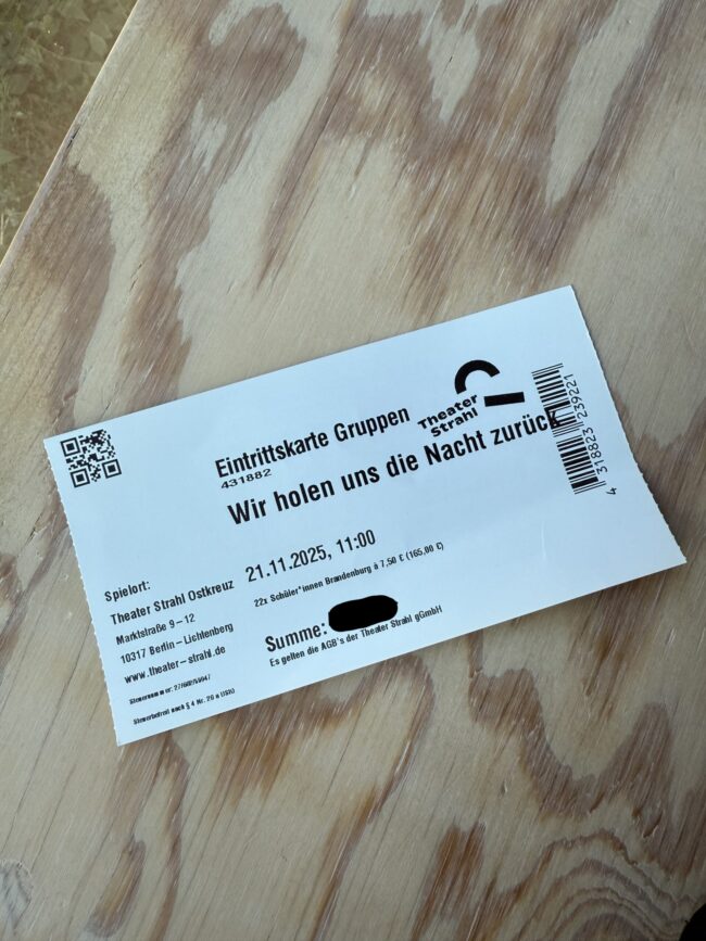 Die 8b holt sich die Nacht zurück! Kultur statt Klassenzimmer: Am 21. November war die Klasse 8b anlässlich des Lesetags im Theater Strahl zu Gast. Wir haben uns das Stück „Wir holen uns die Nacht zurück“ angesehen. Eine intensive Vorstellung und ein toller gemeinsamer Tag für die ganze Klasse!