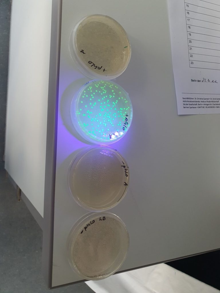 Hierbei wurde zunächst mittels Restriktionsverdau und anschließender Agarose-Gelelektrophorese der erfolgreiche Einbau von Fremd-DNA in ein Plasmid geprüft. Anschließend wurden die Plasmide durch Transformation in kompetente Zellen eingeschleust. Und schließlich erfolgte die Selektion der Bakterien mit Plasmid und Fremd-DNA mithilfe einer auf dem Plasmid codierten Antibiotikaresistenz, die ein Wachstum auf einem entsprechenden Nährmedium ermöglichte. Am Ende wurden schließlich die Bakterien, die das Plasmid mit der Fremd-DNA besaßen, zum Leuchten gebracht.