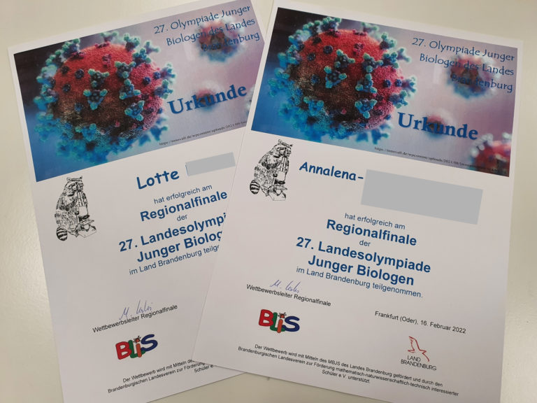 Am 16.02.2022 haben zwei Schülerinnen unserer 8. Klassen am Regionalfinale der Biologielandesolympiade teilgenommen. Bedingt durch die Corona-Situation konnte dies auch in diesem Jahr nur an den Schulen selbst bestritten werden. Eine 90-minütige Klausur wurde absolviert. Wir warten gespannt auf die Ergebnisse.