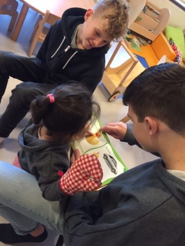 Klasse 7a: Am Freitag machten sich die Schülerinnen und Schüler der 7a, mit großer Neugier, ein wenig aufgeregt und bewaffnet mit mehreren Stapeln Kinderbücher auf den Weg zum Vorlesen in die KITA Adlerküken.