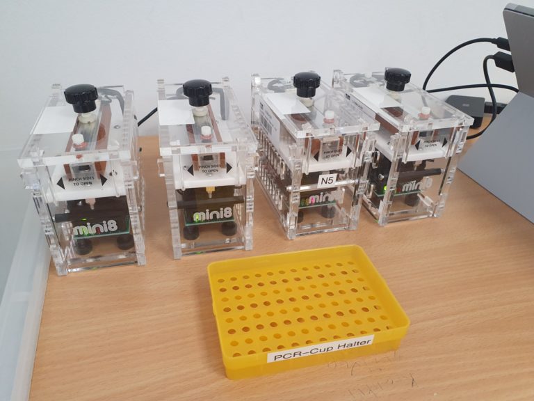 Das nötige Equipment für diese Vor-Ort-Versuche direkt in unserer Schule wurde, wie schon in den Jahren zuvor, freundlicherweise von der Technischen Universität München und der Universität Potsdam im Rahmen des „Amgen Biotech Experience Programms“ leihweise zur Verfügung gestellt
