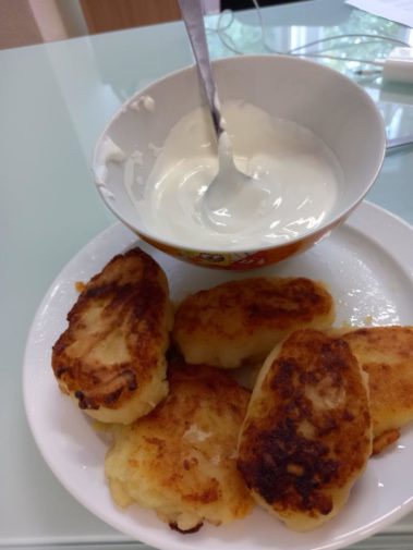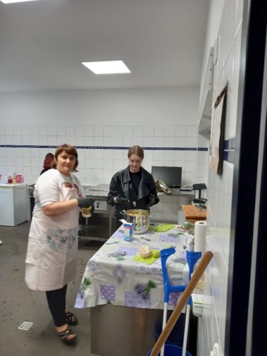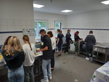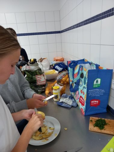 Wir kochen Gerichte aus verschiedenen Ländern und erstellen ein internationales Kochbuch. Dienstag haben wir Tuschonaja Kartoshka gekocht, Mittwoch standen die ukrainischen Pancakes auf dem Speiseplan und Donnerstag gab es polnische Pirogi. Das Kochbuch ist auch auf unserer Homepage zu finden.