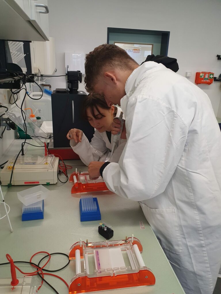 Am 10.10.2023 besuchte die Klasse 13 im Rahmen des Biologieunterrichts das Gläserne Labor Berlin-Buch und absolvierte dort einen vierstündigen Laborkurs zum Thema „Klonierung – Restriktionsenzyme und Transformation“. Ziel war es, mithilfe molekularbiologischer Methoden gentechnisch modifizierte Bakterien zu erzeugen, die aufgrund der Expression eines grün-fluoreszierenden Proteins (GFP), welches natürlicherweise in einer Tiefseequallenart zu finden ist, bei Anregung mit UV-Licht leuchten. Viele Arbeitsschritte sind dabei nötig, bis am Ende leuchtende Bakterienkolonien bewundert werden können. Da der Gesamtprozess den zeitlichen Rahmen des Workshops sprengen würde, wurde ein wenig „getrickst“. Die von uns mit einem GFP-codierenden Plasmid transformierten Bakterien mussten erst über Nacht zu sichtbaren Kolonien heranwachsen. Daher haben wir die Ergebnisse einer Gruppe vom Vortag ausgewertet, die aber – wie hoffentlich auch wir – beste Arbeit geleistet und leuchtende Kolonien erzeugt haben.