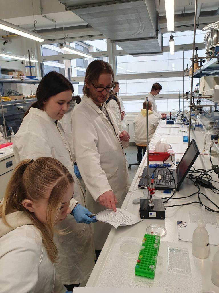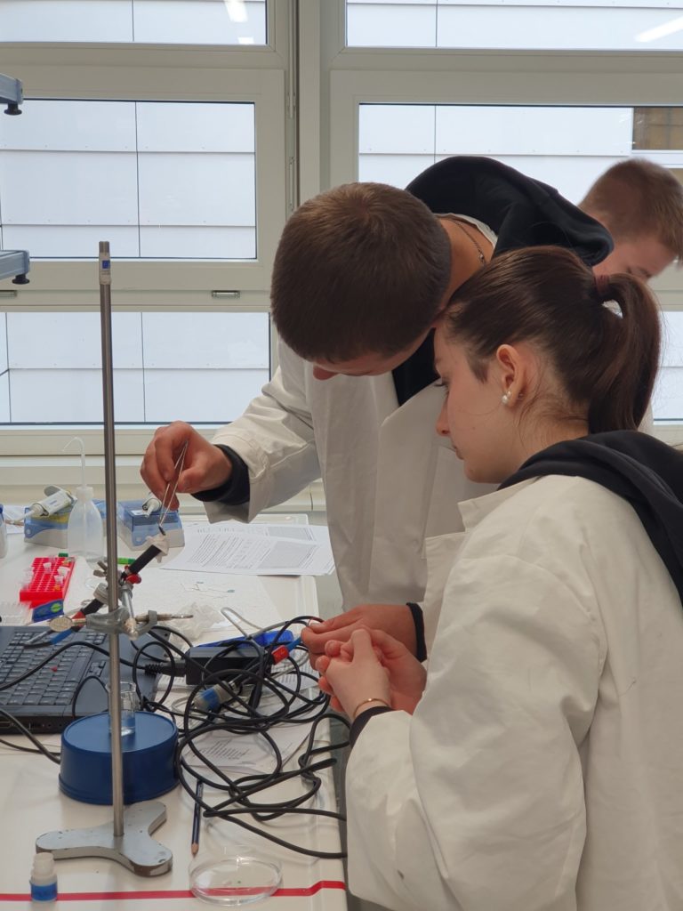 Am 24. Februar 2023 besuchte die Klasse 11 die Technische Hochschule Wildau und absolvierte dort den Schülerlaborkurs „Glucose-Biosensor“. Nach einer theoretischen Einführung über verschiedene Möglichkeiten des qualitativen und quantitativen Nachweises von Glucose in Lösungen wurden die vorgestellten Methoden praktisch durchgeführt. Das Enzym Glucoseoxidase spielte für die Versuche dabei eine Schlüsselrolle. Es katalysiert die Oxidation von Glucose durch Sauerstoff. Die Umsetzung kann über eine anschließende Farbreaktion nachgewiesen werden. Auf diese Weise galt es z.B. Cola von Cola light zu unterscheiden und den Glucosegehalt einer unbekannten Probe mithilfe einer zuvor erstellten Eichkurve zu ermitteln. In einem dritten Versuch wurde schließlich über die Stärke der Sauerstoffabnahme während der Glucoseoxidase-Reaktion indirekt auf die Glucosemenge in einer Lösung geschlossen.