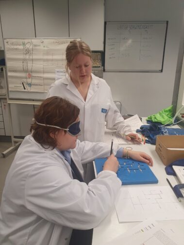 Neun Stationen standen den Schülerinnen und Schülern zum Experimentieren zur Verfügung. Neben Modellexperimenten zum Messen von Potenzialen an verschiedenen Membranen wurden auch Regenwurm und Mensch als Versuchsobjekte zum Erkenntnisgewinn genutzt. Dabei wurden beispielsweise die Leitungsgeschwindigkeiten verschiedener Nervenfasern ermittelt sowie Augen- und Unterarmmuskelbewegungen untersucht. Auch das eigene Lernverhalten konnte anhand der Arbeit mit einem Fingerlabyrinth sowie mit einer Prismenbrille dokumentiert werden. Zudem wurde den Ursachen der neurodegenerativen Erkrankung Alzheimer auf den Grund gegangen. Zum Abschluss präsentierten alle Gruppen einander ihre jeweiligen Ergebnisse und werteten diese aus.