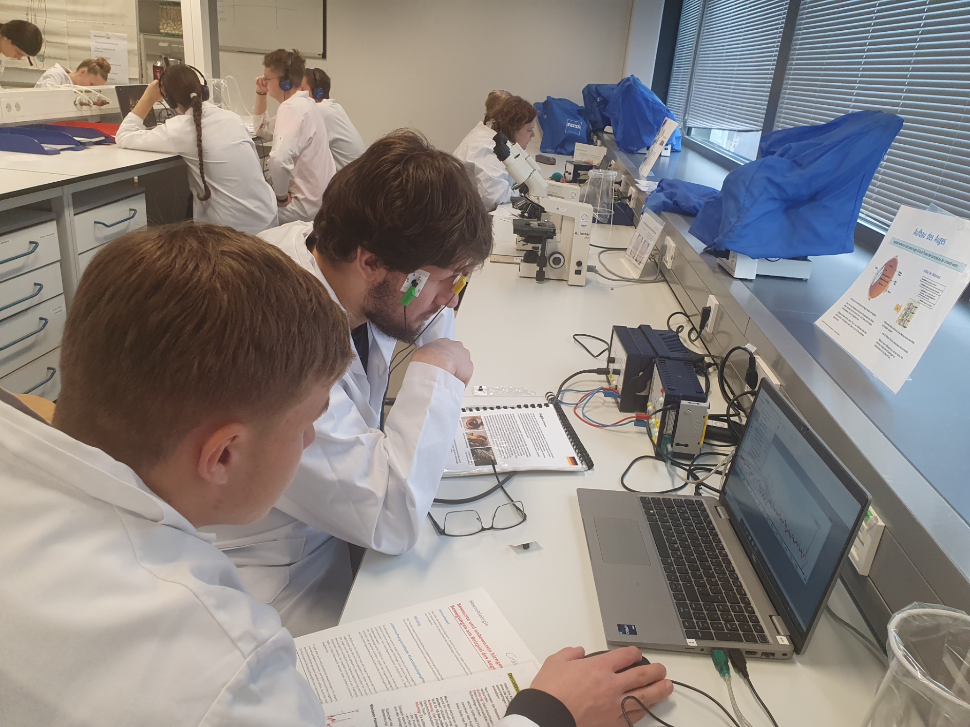 Nervenzellen in Aktion – so das Motto des Laborkurses „Neurone und Gliazellen“, welcher von unseren Biologiekursen des Jahrgangs 12 im Gläsernen Labor Berlin-Buch besucht wurde.