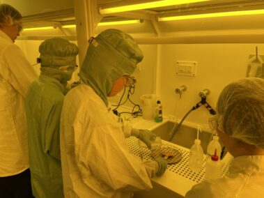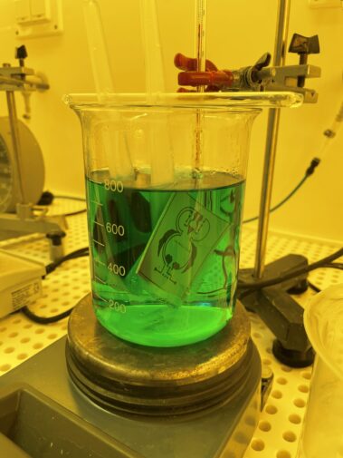 Als Höhepunkt des naturwissenschaftlichen Unterrichts in der Jahrgangsstufe 8 konnten die jungen Menschen dort die hervorragenden Möglichkeiten zum Experimentieren nutzen. Vorbereitet durch den Fachunterricht wurden entweder mit Aluminium bedampfte Glasplatten im lithografischen Verfahren mit wunderschönen Motiven selbst gestaltet oder Leiterplatten geätzt und anschließend mit elektronischen Bauteilen bestückt. Es wurde kreativ gestaltet, im Reinraum gearbeitet, Schaltungen mit Hilfe des Mikroskops geprüft und gelötet. Die einzigartigen Ergebnisse konnten alle mit nach Hause nehmen. Die folgenden Fotos möchten einen kleinen Einblick in die Arbeit unserer Nachwuchs-Naturwissenschaftler geben.