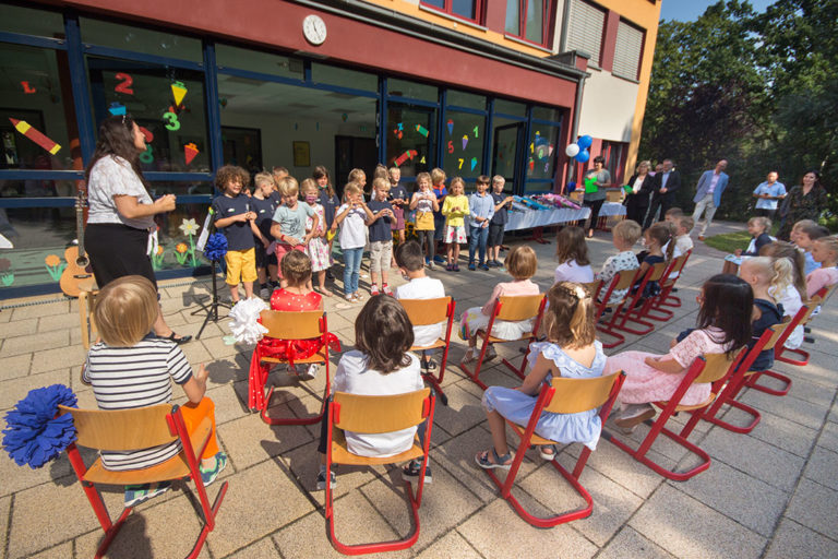 Bei Sonnenschein und angenehmen Temperaturen wurden die aufgeregten Kinder herzlich von ihrer Klassenlehrerin Frau Malewska empfangen. Nach den Begrüßungsworten von Anna Maria von Platen und der Schulleiterin Frau Schersching, haben die Schülerinnen und Schüler der zweiten Klasse mit Stolz ihr fleißig eingeübtes Programm vorgesungen. Im Anschluss spielten die ehemalige Schülerin Aneray Heidenreich zusammen mit einer Freundin zwei wunderschöne Stücke auf ihren Geigen. Die Schulanfängerinnen und –Anfänger bekamen in einer festlichen Zeremonie ihre eindrucksvoll geschmückten, reich gefüllten Schultüten und die traditionelle Sonnenblume überreicht.