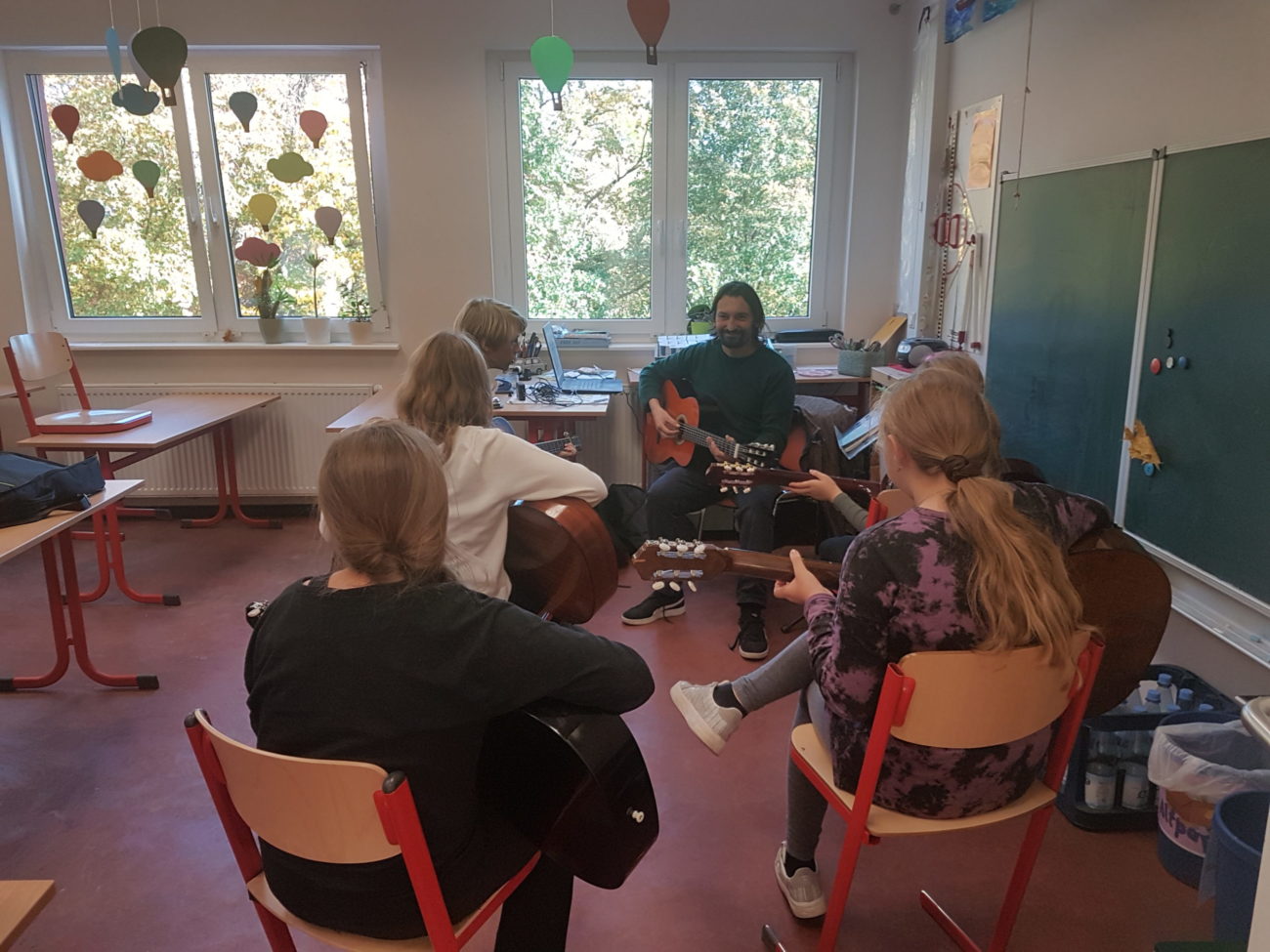 Bist du Musikliebhaber, dann hast du bei uns mittwochs die Möglichkeit gemeinschaftlich die verschiedensten Lieder mit anzustimmen, wenn die Schülerinnen und Schüler der Klassenstufen 4 bis 6 ihre Gitarrenseiten zum Klingen bringen.