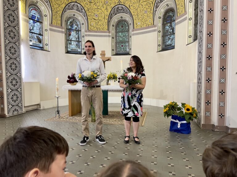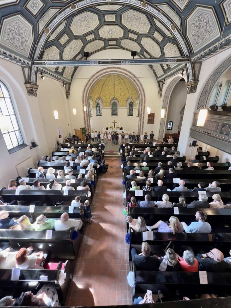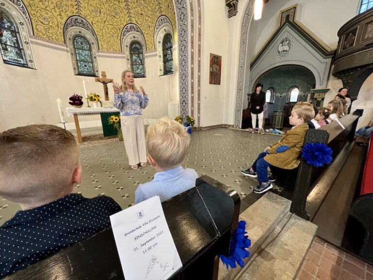 Die aufgeregten und stolzen Kinder betraten mit leuchtenden Augen und unter dem eindrucksvollen Klang der Orgel die feierlich dekorierte Friedenskirche Wildau in unserer direkten Nachbarschaft. Nachdem sie ihren Platz in der ersten Reihe eingenommen hatten, wurden die Erstklässlerinnen und Erstklässler mit einfühlsamen Worten von Anna-Maria von Platen und Heike Schersching begrüßt. Die Schülerinnen und Schüler der Klasse 2 präsentierten ihr liebevoll einstudiertes Einschulungsprogramm, welches den Erstklässlerinnen und Erstklässlern sowie den Gästen sehr gefiel.