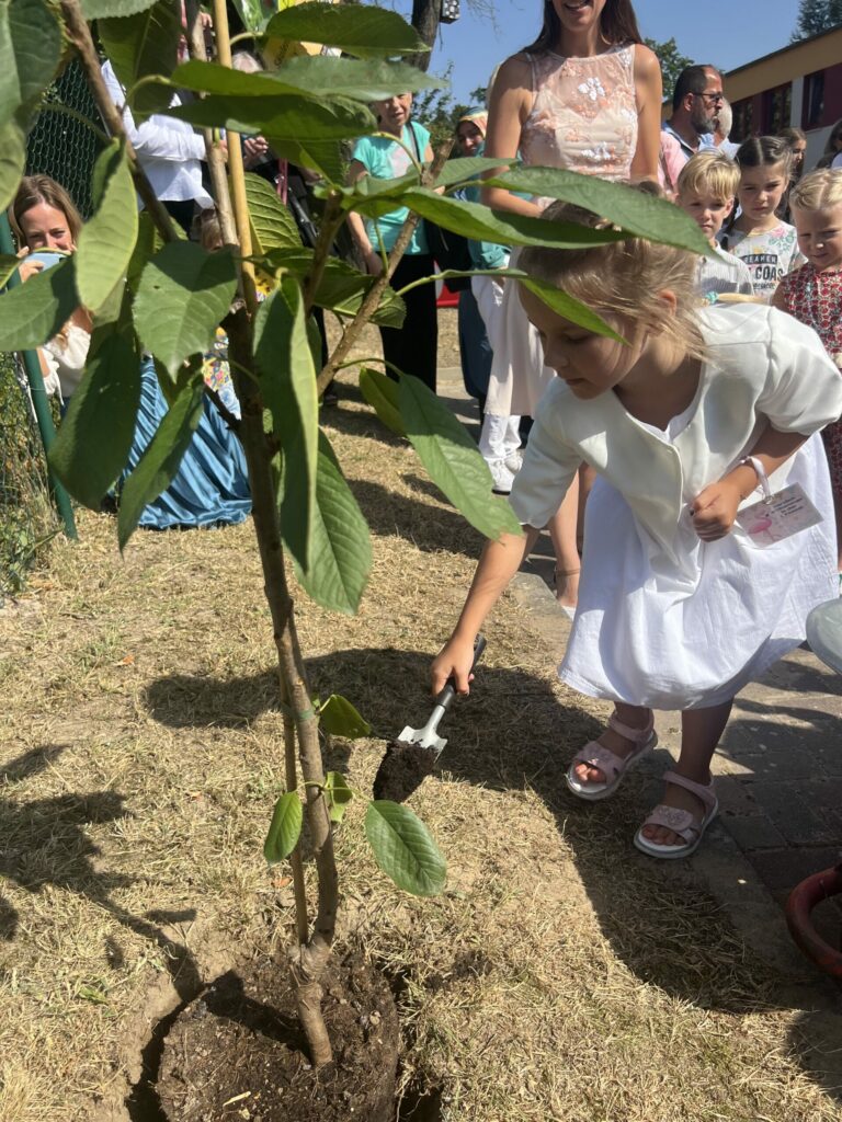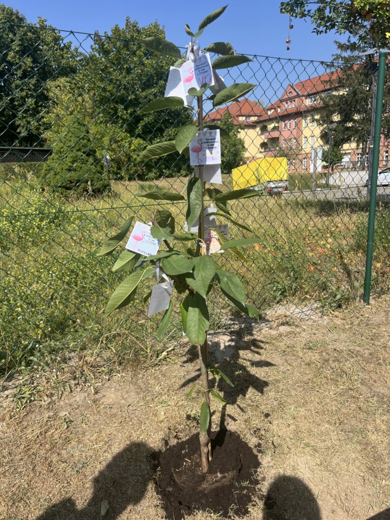 Während der anschließenden ersten „Unterrichtsstunde“ im Klassenraum bastelten die neuen Schülerinnen und Schüler Namensschilder, die die Kinder beim traditionellen Pflanzen des klasseneigenen Baumes anhängen konnten.
