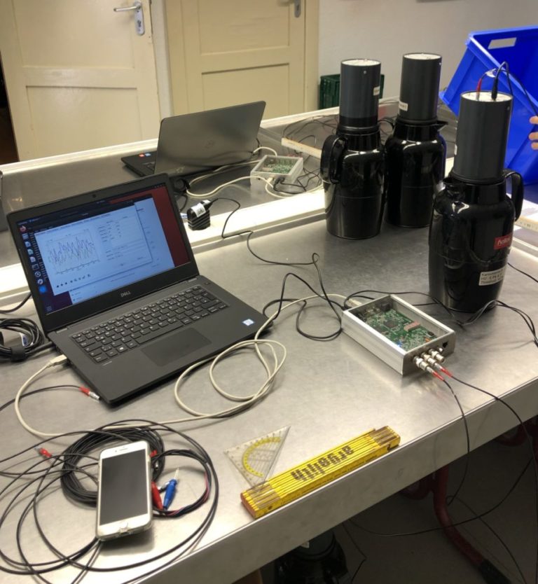 Zur Detektion von Myonen, die durch kosmische Strahlung in der Atmosphäre entstehen, wurden vier verschieden Experimente durchgeführt. Zur Untersuchung des Einfallswinkels der Teilchen wurden zwei Experimente durchgeführt: eine Anordnung mit Kamiokannen (Abb. 1) und eine improvisierte CosMO-Mühle (Abb. 2). Kamiokannen sind wassergefüllte Kaffeekannen, deren Deckel mit einem Detektor für Lichtblitze ausgestattet ist, welche Myonen bei ihrer Wechselwirkung mit Wassermolekülen in der Kanne hervorrufen. Die CosMO-Mühle besteht aus zwei Platten mit je einer Einheit (Szintillator), die eintreffende Myonen über deren Lichtblitze registrieren, welche die Myonen bei ihrer Wechselwirkung mit dem Szintillator hervorrufen. Diese Platten sind in einem festen Abstand von ca. 3 m aufgebaut. Zur Feststellung des Winkels wird die Ausrichtung der Detektoren um 15° alle 15 Minuten geändert und die Anzahl der Myonen, die den Versuchsaufbau durchqueren, von einem Programm gezählt.
