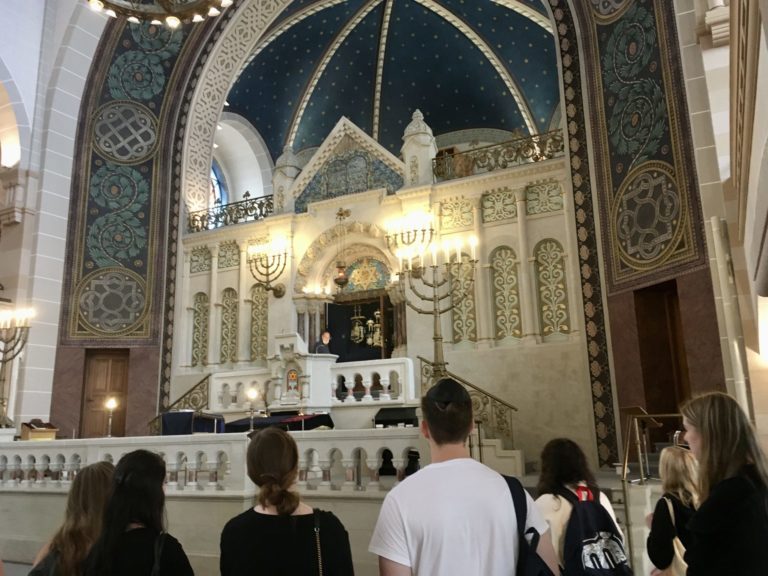 Am Montag vor den Sommerferien besuchten wir, die 11b, die Synagoge in der Berliner Rykestraße. Die 1904 erbaute Synagoge gehört zu den größten Synagogen Europas und beeindruckt durch ihre wunderschöne Architektur. In der Pogromnacht 1938 wurde sie zwar in Brand gesteckt, doch auf-grund der unmittelbaren Nähe zu Wohnhäusern wurde der Löschungsbefehl sehr schnell angeordnet, sodass die Synagoge die Zeit des Nationalsozialismus überlebte.
