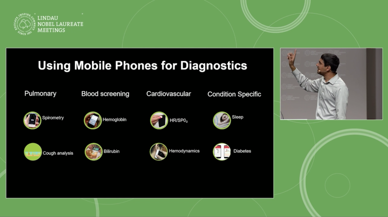 In dem diesjährigen Heidelberg-Vortrag zeigte Shwetak Patel das Aufkommen von Mobiltelefonen und Wearables für die Gesundheit auf. So lassen sich die dort standardmäßig verbauten Sensoren, wie Mikrofone, Kameras, Beschleunigungssensoren, Umgebungslicht-Sensoren, kapazitiver Touchscreen, Temperatursensoren etc., in Kombination mit künstlicher Intelligenz auf verschiedene Weise z.B. in einer Hämoglobin-App zur Bestimmung von Hämoglobin verwenden. Dabei wird der Finger auf Kamera und Lichtquelle gelegt, und über Durchstrahlung des Fingers und Reflexionen darin kann der Hämoglobingehalt bestimmt werden, ohne dass eine Blutabnahme erforderlich ist. Die Hb-App funktionierte mit vergleichbarer Qualität wie ein komplexes klinisches Gerät, das ebenfalls Hämoglobin misst, allerdings anhand von Blut, das zunächst abgenommen werden muss. Gleichfalls lassen sich Größen, wie Puls, Atemfrequenz, die Körpertemperatur mit entsprechenden Apps unter Verwendung anderer Sensoren bestimmen.