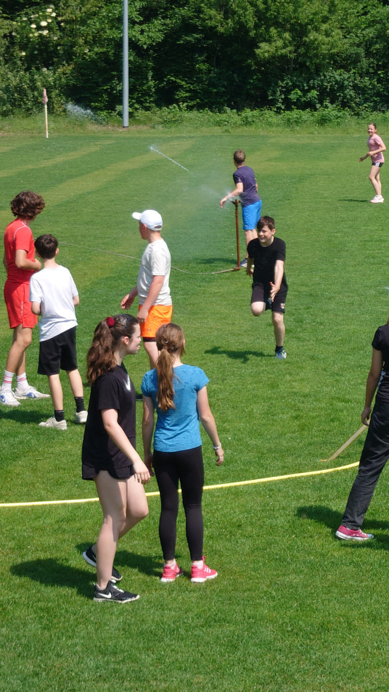 Und so wurde in der Zeit zwischen den Wettkämpfen an den Stationen Schatten gesucht und der Rasensprenger für eine kühlende Dusche genutzt.