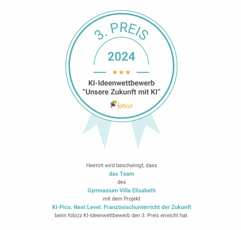 Wildau, 01.10.24 – Das Gymnasium Villa Elisabeth darf sich über eine besondere Auszeichnung freuen: Beim Ideenwettbewerb “Unsere Zukunft mit KI” wurde das Team mit dem 3. Preis ausgezeichnet. Mit ihrem kreativen und innovativen Projekt „KI-Pics. Next Level. Französischunterricht der Zukunft“ haben die Schülerinnen und Schüler eindrucksvoll gezeigt, wie sie die Möglichkeiten der künstlichen Intelligenz nutzen wollen, um zukunftsweisende Ideen zu entwickeln.