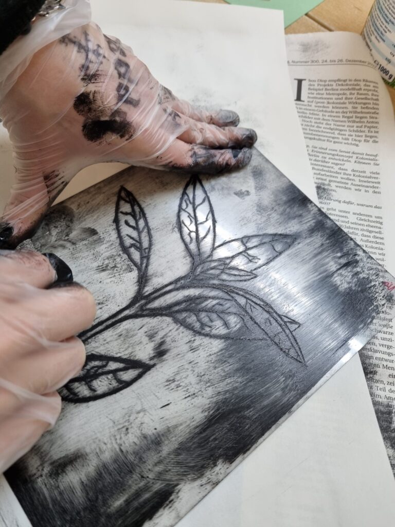Es hört sich so leicht an: man muss ja nur ganz genau das zeichnen, was man sieht. Also: genau hinsehen, ja… und dann eben nur, äh… zeichnen! Hinsehen ist leicht, aber der Rest!? Doch die Mühe hat sich gelohnt! Die Zeichnungen von Pflanzen dienten als Vorlage für die Kaltnadelradierungen. Ein besonderer Tag: der Kunstraum als Profidruckwerkstatt, aufgeregte junge Künstler, merkwürdig müffelnde Druckfarbe in Preußisch Blau, Sepia und Braunschwarz, jede Menge Walzen, Farbfinger, Gazeknuddel… Erst Farbe auf den Druckstock, dann Farbe absolut sauber wieder runter vom Druckstock. Vorsicht, keine Fingerabdrücke hinterlassen! Warten, bis die Presse frei ist, feuchtes Papier auf den Druckstock, aber Achtung: saubere Finger! Filz vorsichtig glätten, dann drucken, gleichmäßig und behutsam, aber bitte mit Kraft! Geht alles! Und dann das Ganze wieder von vorn. Großer Aufwand und… ja: große Wirkung!!! Wenn die Zeichnung vielleicht noch nicht so richtig gekonnt aussah, die Drucke tun dies allemal! Logisch, wenn junge Künstler am Werk sind!