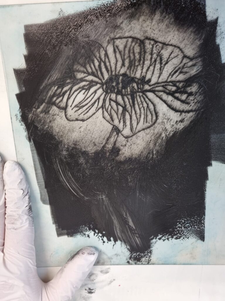 Es hört sich so leicht an: man muss ja nur ganz genau das zeichnen, was man sieht. Also: genau hinsehen, ja… und dann eben nur, äh… zeichnen! Hinsehen ist leicht, aber der Rest!? Doch die Mühe hat sich gelohnt! Die Zeichnungen von Pflanzen dienten als Vorlage für die Kaltnadelradierungen. Ein besonderer Tag: der Kunstraum als Profidruckwerkstatt, aufgeregte junge Künstler, merkwürdig müffelnde Druckfarbe in Preußisch Blau, Sepia und Braunschwarz, jede Menge Walzen, Farbfinger, Gazeknuddel… Erst Farbe auf den Druckstock, dann Farbe absolut sauber wieder runter vom Druckstock. Vorsicht, keine Fingerabdrücke hinterlassen! Warten, bis die Presse frei ist, feuchtes Papier auf den Druckstock, aber Achtung: saubere Finger! Filz vorsichtig glätten, dann drucken, gleichmäßig und behutsam, aber bitte mit Kraft! Geht alles! Und dann das Ganze wieder von vorn. Großer Aufwand und… ja: große Wirkung!!! Wenn die Zeichnung vielleicht noch nicht so richtig gekonnt aussah, die Drucke tun dies allemal! Logisch, wenn junge Künstler am Werk sind!