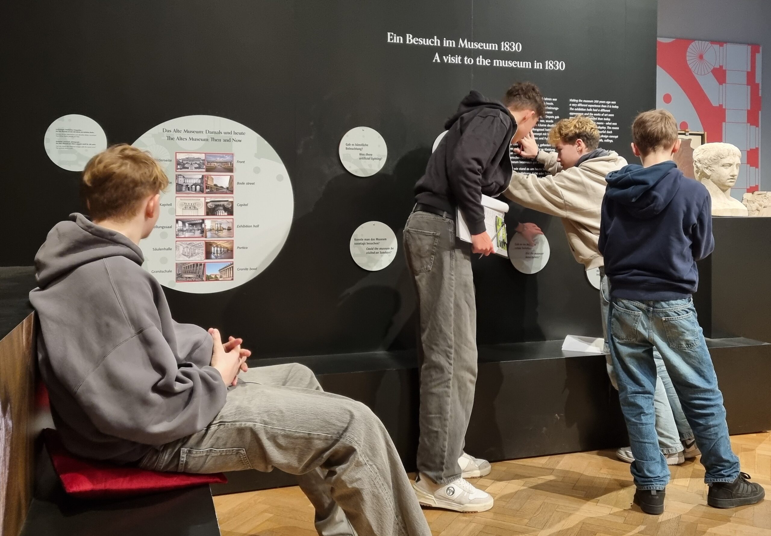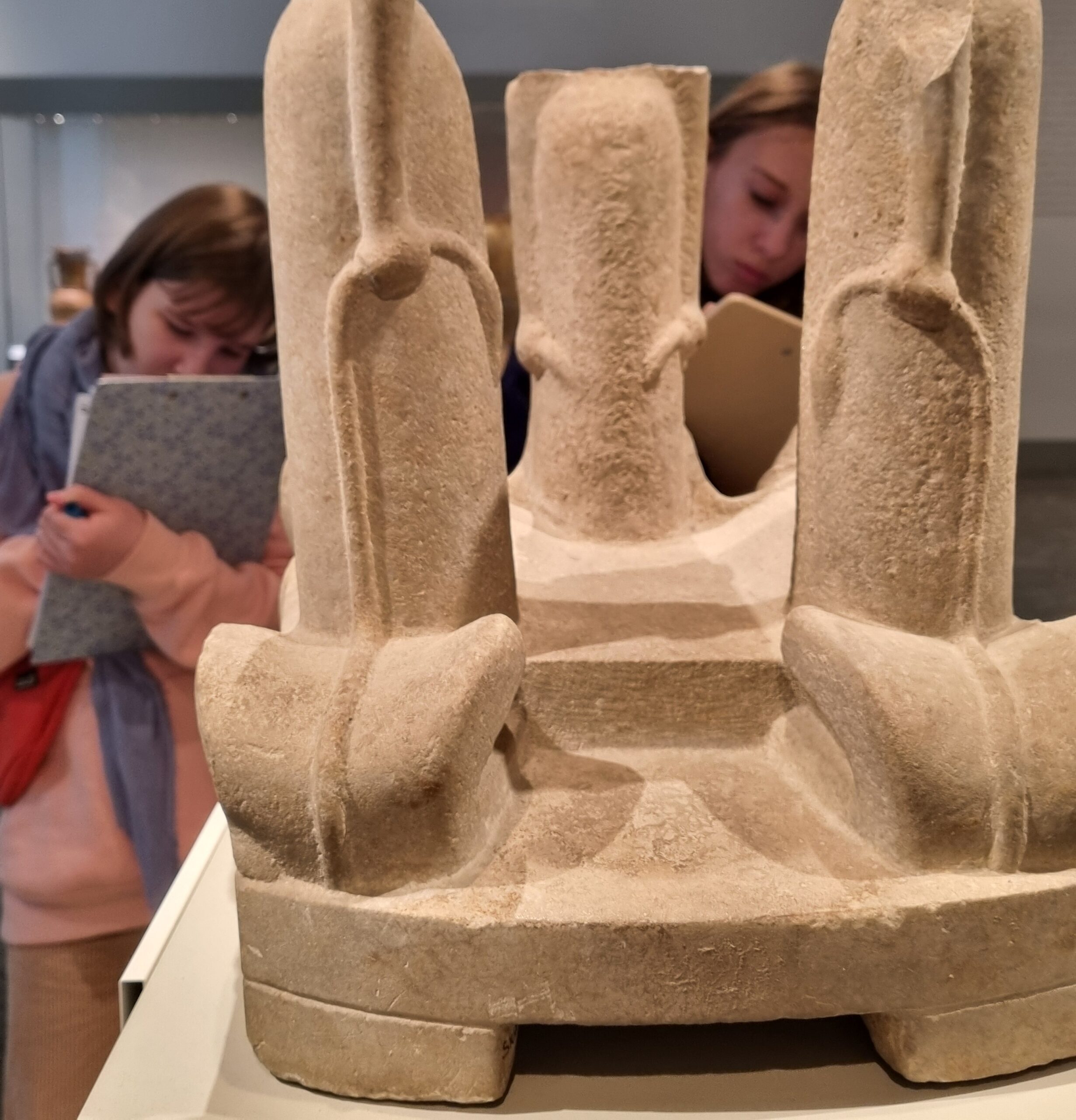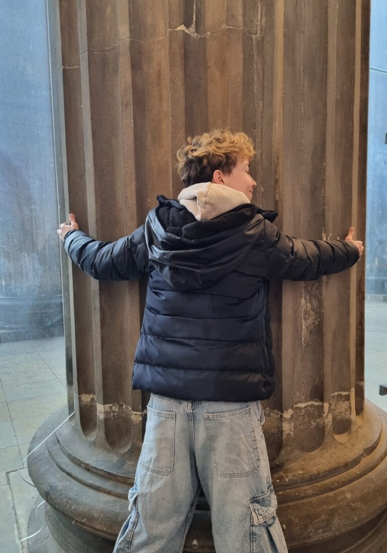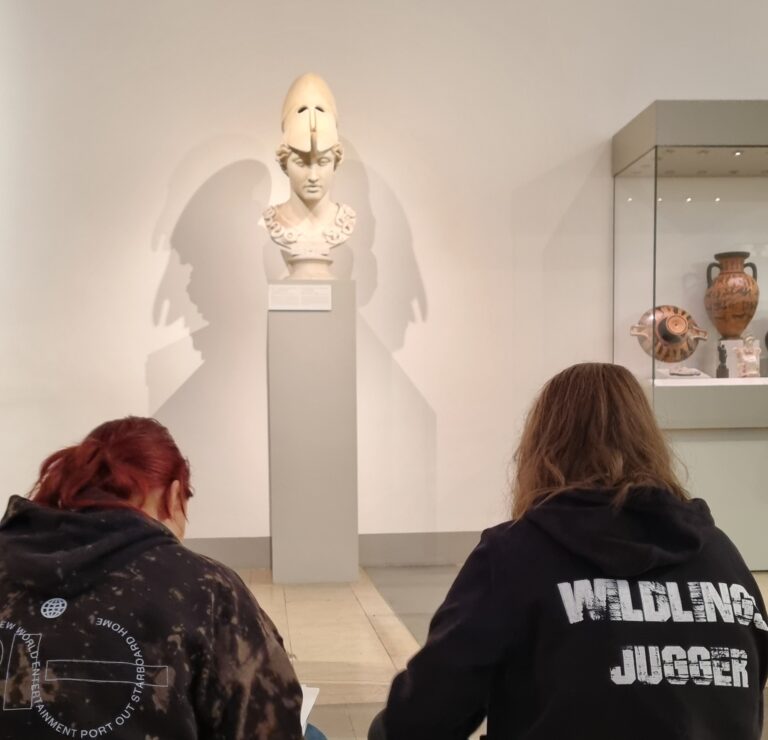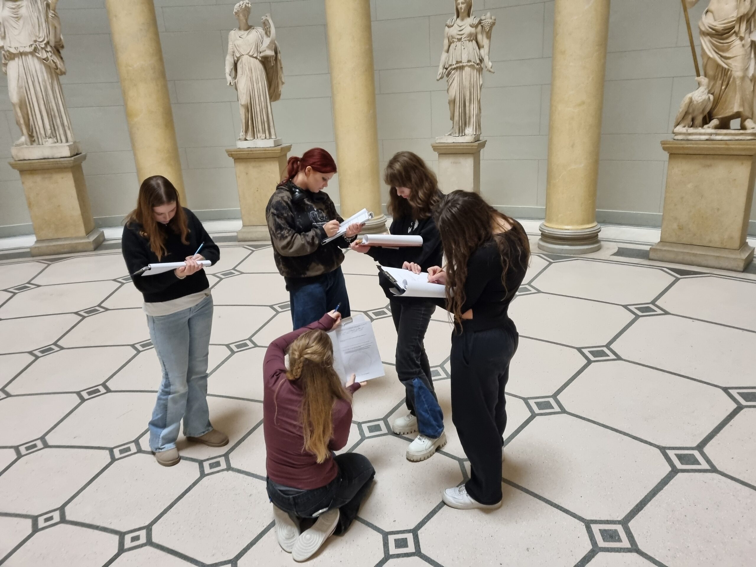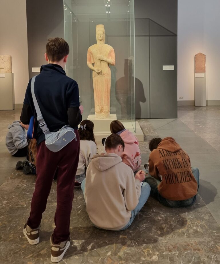 Was für ein wunderschöner Saal! Aber man muss sich auch Zeit nehmen für die Rotunde, denn nur so kann man diese Pracht auf sich wirken lassen und die Details erfassen. Der Arbeitsauftrag lautet: Genau hinsehen! Schlendert man jedoch unaufmerksam durch die Ausstellungsräume, wird man auch den kleinen Löwen ganz sicher übersehen! Nun gut, er sieht auch eher aus wie ein Mops, aber er ist definitiv ein Löwe! Und nur der aufmerksame Betrachter wird feststellen, dass die Antike wirklich bunt war, auch wenn von den Farben heute kaum noch etwas zu sehen ist. Aber das ist ja alles auch schon ewig her! Nirgends ist mehr ein leuchtendes Rot, Gelb oder Blau zu entdecken, von Quietschrosa oder Gold absolut keine Spur! Überall nur schlichtes und edel wirkendes Weiß! Aber wer ganz genau hinschaut, kann an einigen Skulpturen noch Reste der ursprünglichen Bemalung erkennen. Tja, und genau hinsehen muss man auch, um die Proportionen erfassen und dann auch noch korrekt zeichnen zu können! Nun, wenn genaues Betrachten doch schon alles wäre! Das Abzeichnen ist nämlich ganz schön schwer!