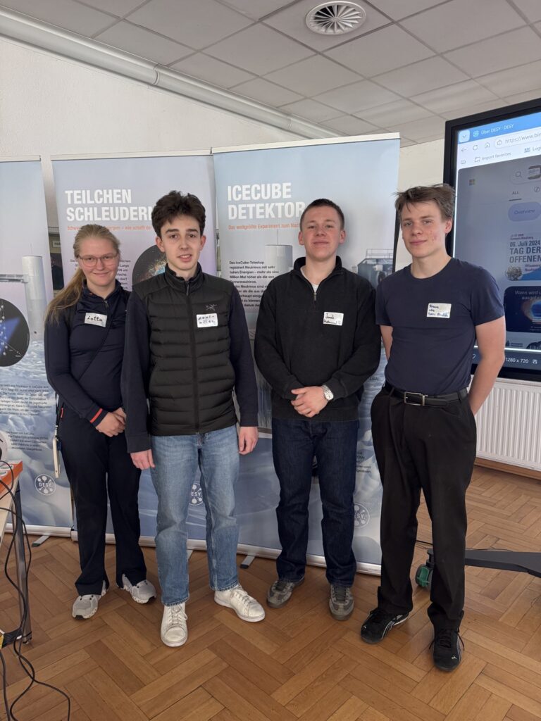 Die IceCube-Masterclass ist ein vom Netzwerk Teilchenwelt zusammen mit dem DESY (Deutsches Elektronen-Synchrotron) Zeuthen organisierter Workshop, bei dem interessierte Schüler Einblicke in den Neutrinodetektor am Südpol erhalten und Daten von dort gewonnen kosmischen Neutrinos auswerten konnten. Am Dienstag, den 21. April 2026, war es für Franz Lenner, Lotta Ludwig, Maximilian Minkwitz und Jonah Winzig soweit. Der Workshop fand am DESY in Zeuthen statt und hier wurden zunächst ein paar Basics vermittelt.